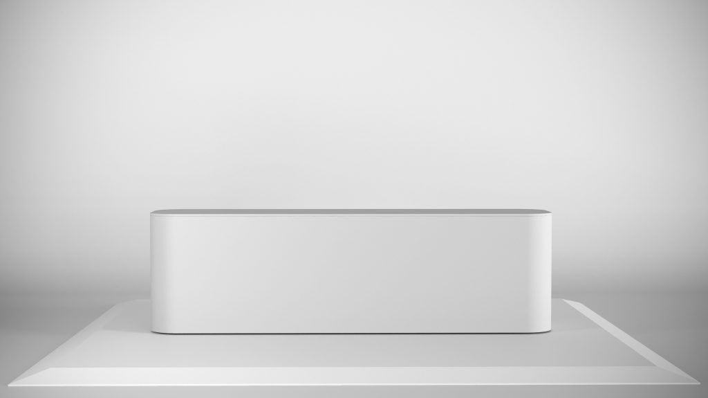A sleek curved edge display frame with an inbuilt 40 inch TV screen and plug and play input, combining branding with digital content. Its clean, integrated design helps draw attention and elevate your presentation.