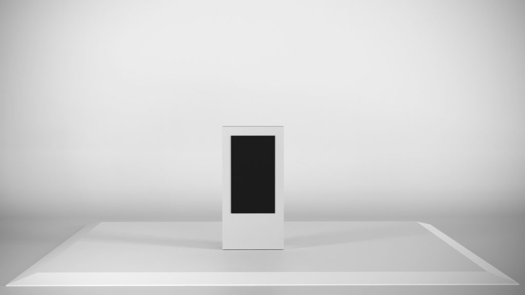 A sleek curved edge display frame with an inbuilt 40 inch TV screen and plug and play input, combining branding with digital content. Its clean, integrated design helps draw attention and elevate your presentation.