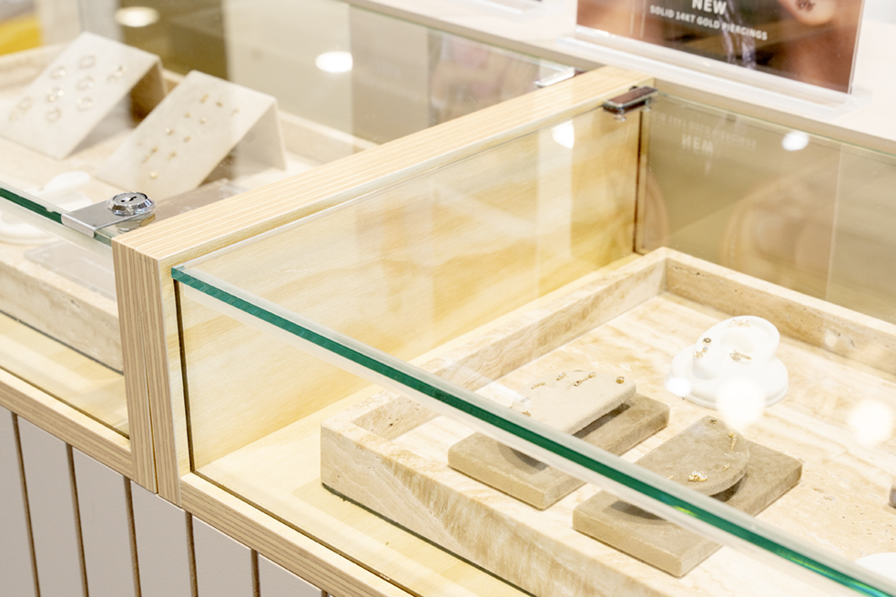 Perfect for glass counter displays, this design creates a sleek and sophisticated atmosphere that enhances any open space or high traffic area. The slat design ties everything together, completing a cohesive look that draws attention while providing a functional and inviting environment for customer interaction.