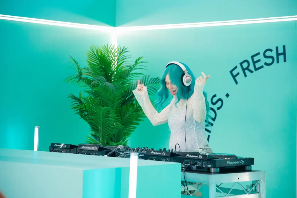 The design incorporated vibrant Bondi Mint branding, accentuated by greenery and clean LED lighting to create a fresh and modern environment. The interior was optimised for both performance and interaction, allowing students to experience DJ sets, engage with podcasting content, and explore the space freely.