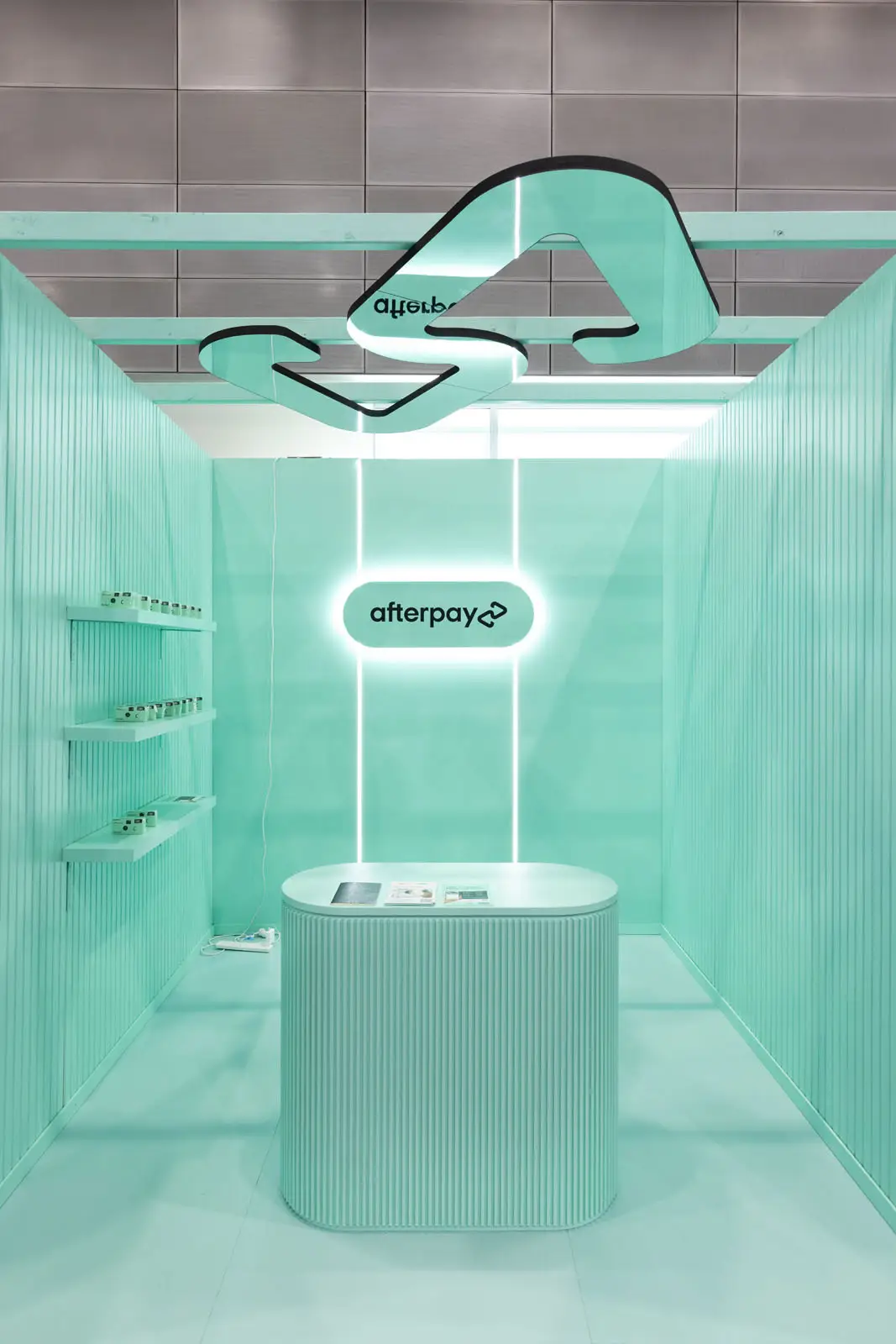 We wanted this mini stand to feel like a natural continuation of Afterpay’s larger six by three expo presence while also celebrating its own unique character. Carrying through the brand’s signature mint tones and bold, playful energy was essential to ensure instant recognition and consistency. The challenge was to condense the essence of Afterpay into a smaller footprint without losing the vibrancy, impact, and interactivity that define the brand.