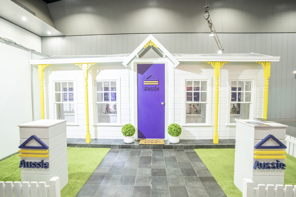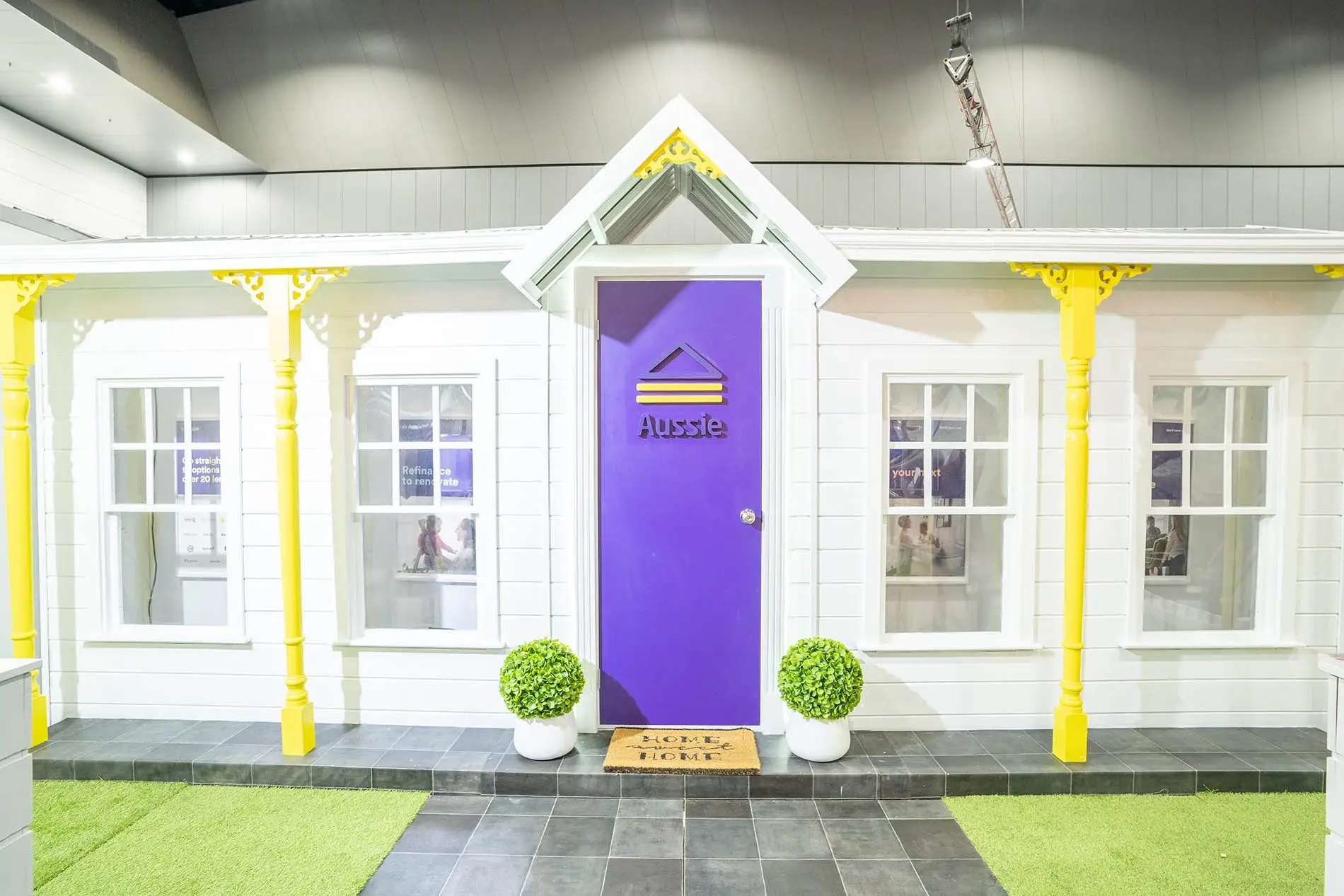 Aussie Home Loans created a standout custom-built exhibition stand that captured attention across the Home Expo, Baby Expo, and Wedding Expo. Designed to resemble a classic Australian home, complete with a purple front door, picket fence, and manicured garden, the structure immediately drew visitors in.