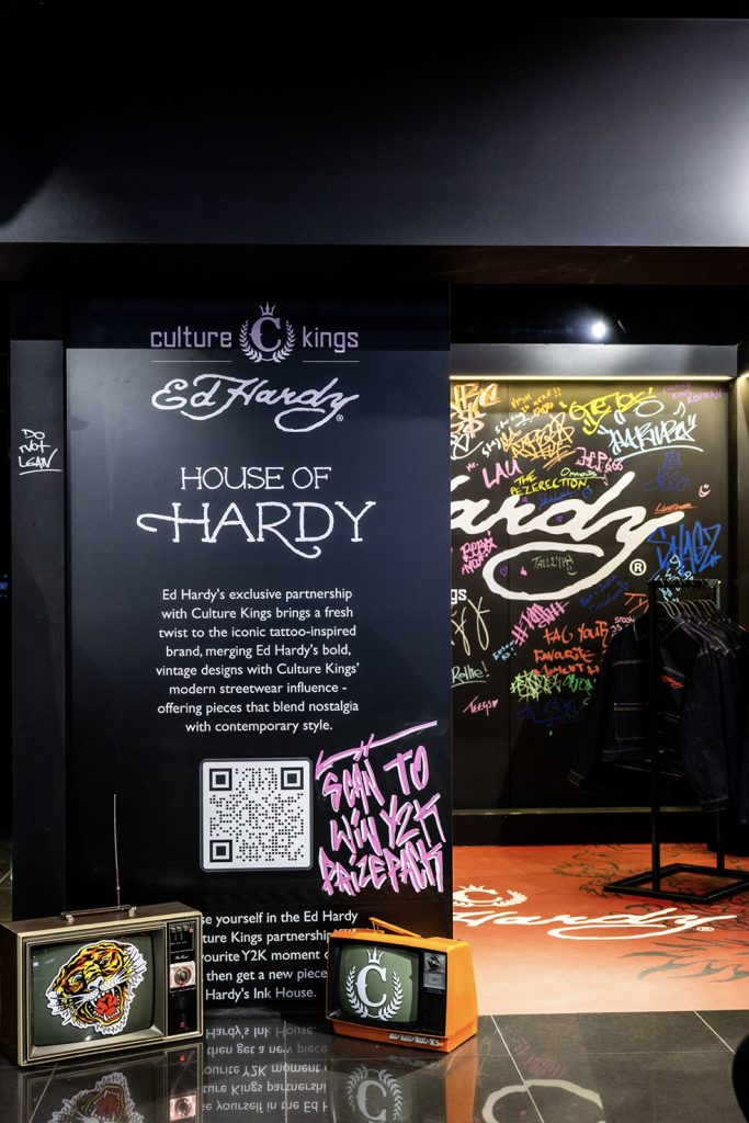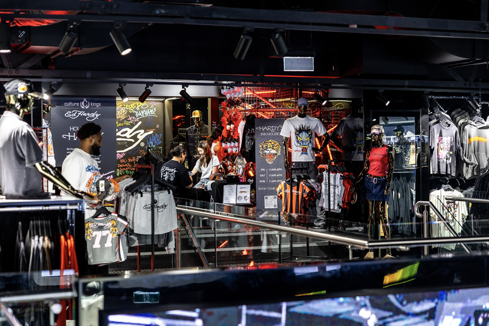 The Ed Hardy x Culture Kings pop-up in Melbourne fuses early 2000s pop culture with streetwear in a bold, immersive experience. At the heart of the activation is the “House of Hardy,” a sleek black LED cube showcasing key Ed Hardy pieces, tattoo-inspired decals, and interactive elements like a Wall of Hats and semi-permanent tattoo stations.