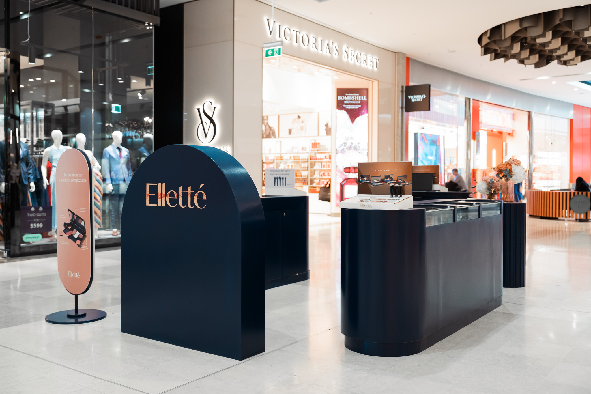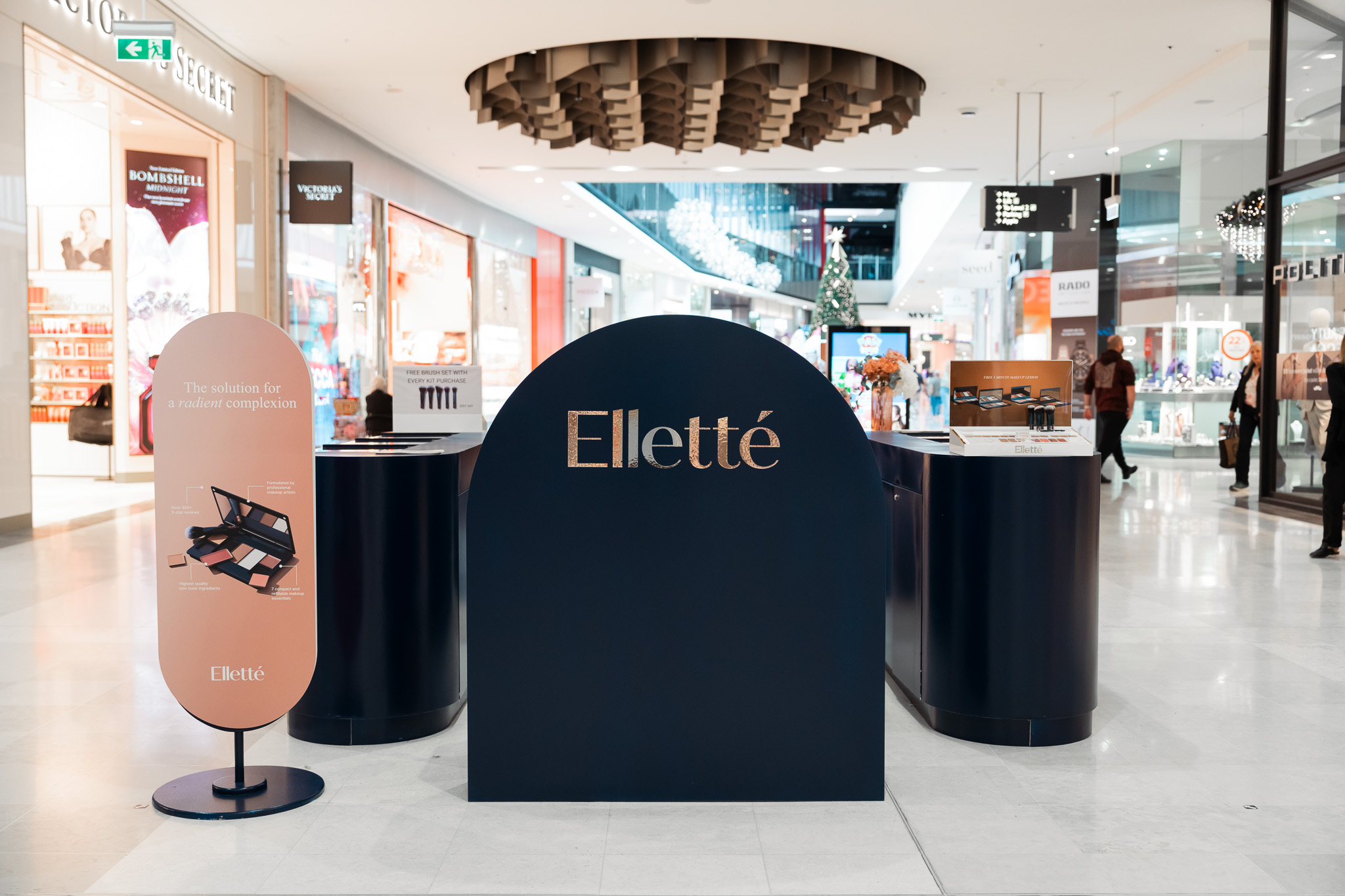 Elletté Make Up brought a bold and elevated beauty experience to Westfield Fountain Gate with a shimmering bronze and deep navy pop up space designed to catch attention from every angle. The combination of rich colours and layered textures created a visually striking environment that stood out within the busy centre.