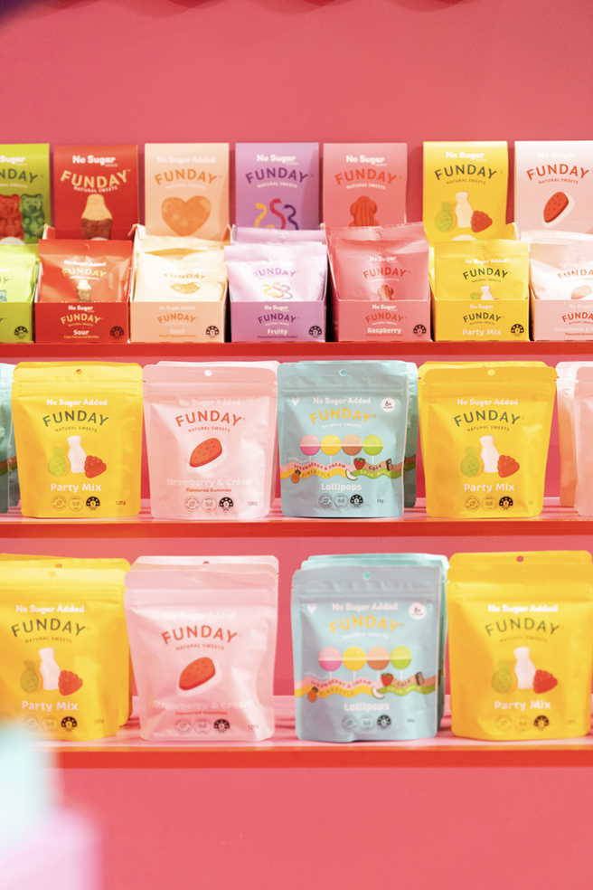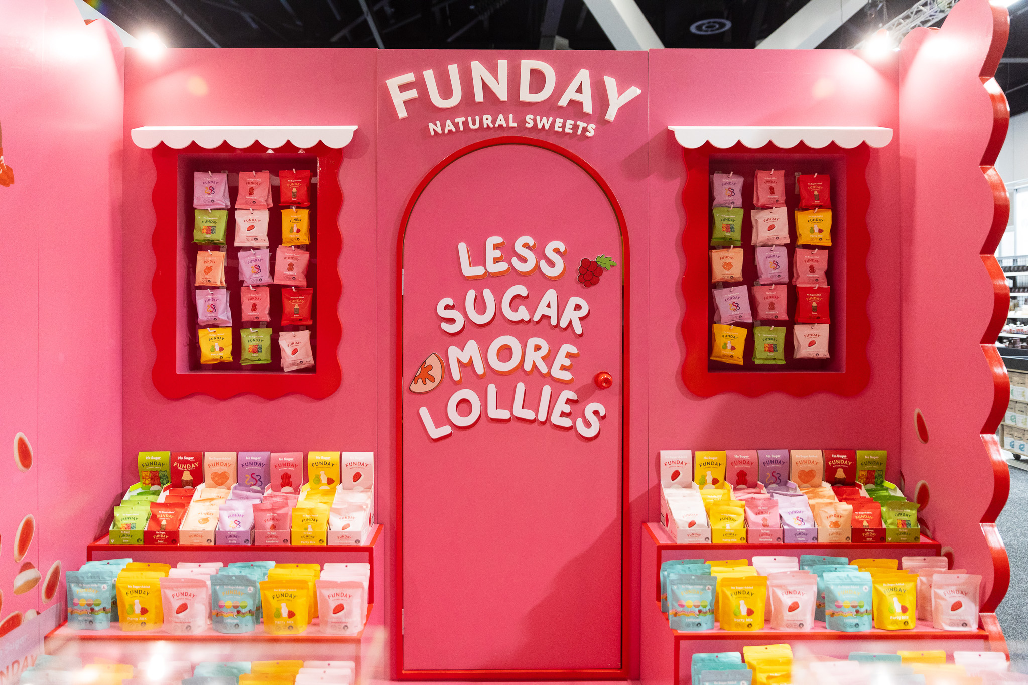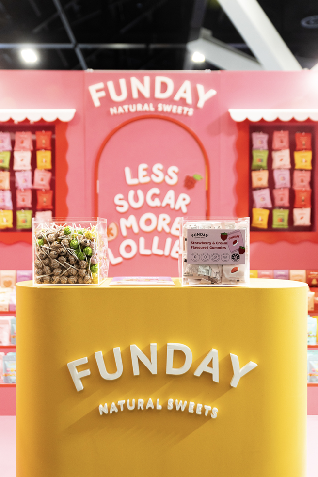 Funday turned heads at Naturally Good Sydney with a booth as sweet as the lollies themselves. Wrapped in a bold candy-pink palette and scalloped edges, the custom build radiated pure joy. With pastel lolly packs stacked high, bold signage reading “Less Sugar, More Lollies,” and cheeky messaging like “Enjoy Lollies Like a Kid Again,” the space drew in curious snackers and sweet-toothed grown-ups alike.