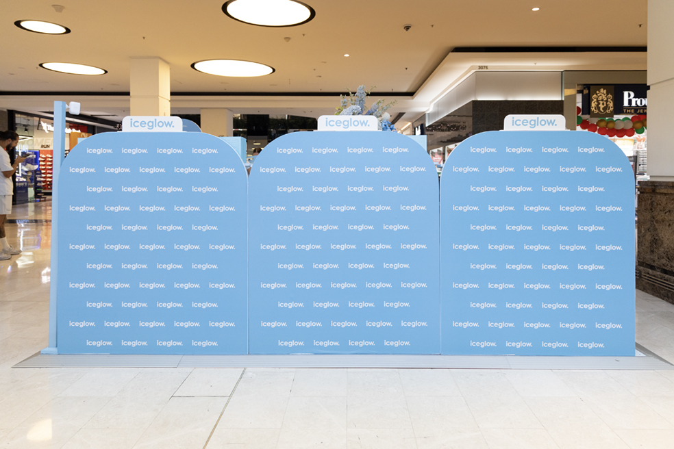 Iceglow brought its signature glow to Parramatta with a vibrant pop-up designed to stop shoppers in their tracks. Finished in Iceglow blue, the space featured a Counter, Cakey Counter, Gondolas, a Lollipop Sign, and a set of Fomo Plinths highlighting hero products.