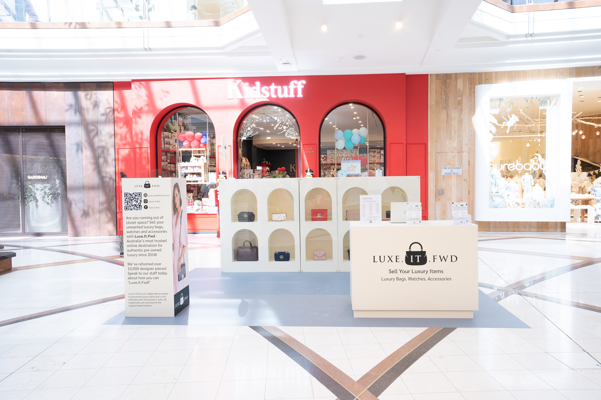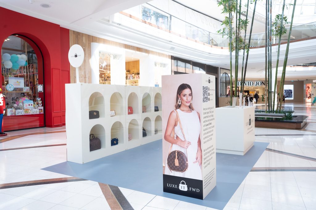 A dedicated branded plinth provided a stylish, practical area for customer exchanges, reinforcing Luxe It FWD’s ethos and creating a seamless, interactive experience that brought luxury resale into the physical retail space.