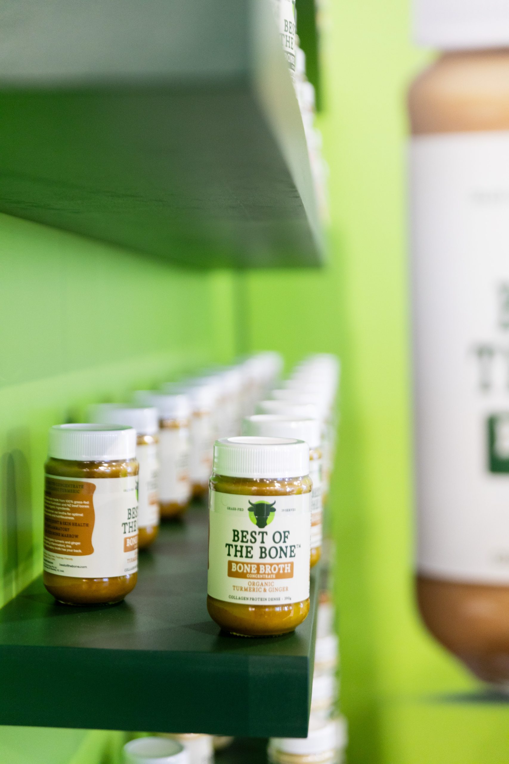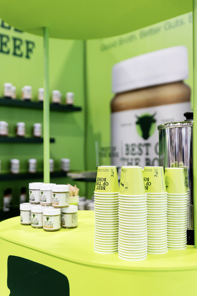 Best of Bone’s side was envisioned as warm, lively, and welcoming. Pops of green, thoughtful product displays, and an interactive broth bar encouraged hands-on engagement and created a vibrant sensory experience.