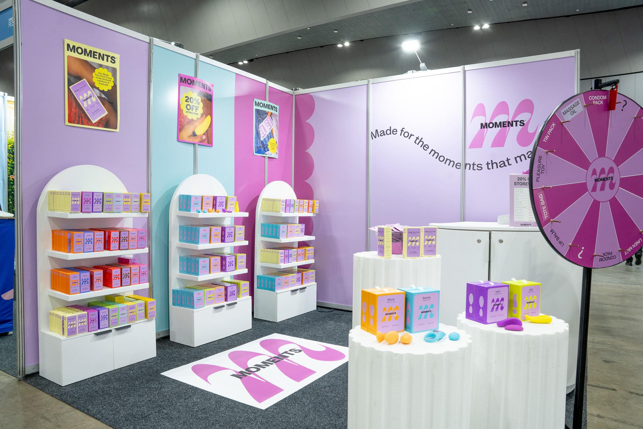 Moments Condoms aimed to make a bold and memorable impression at the Mind Body Expo while keeping within a limited budget. The objective was to highlight the brand’s playful and vibrant packaging while showcasing the full range of products in an engaging way. The stand needed to capture attention from across the expo floor, encourage visitors to explore and interact with the products, and communicate the brand’s fun and approachable personality. Functionality and visual impact were key, with a design that supported interactive elements and engagement opportunities, all achieved without the need for costly custom builds or complex installations.
