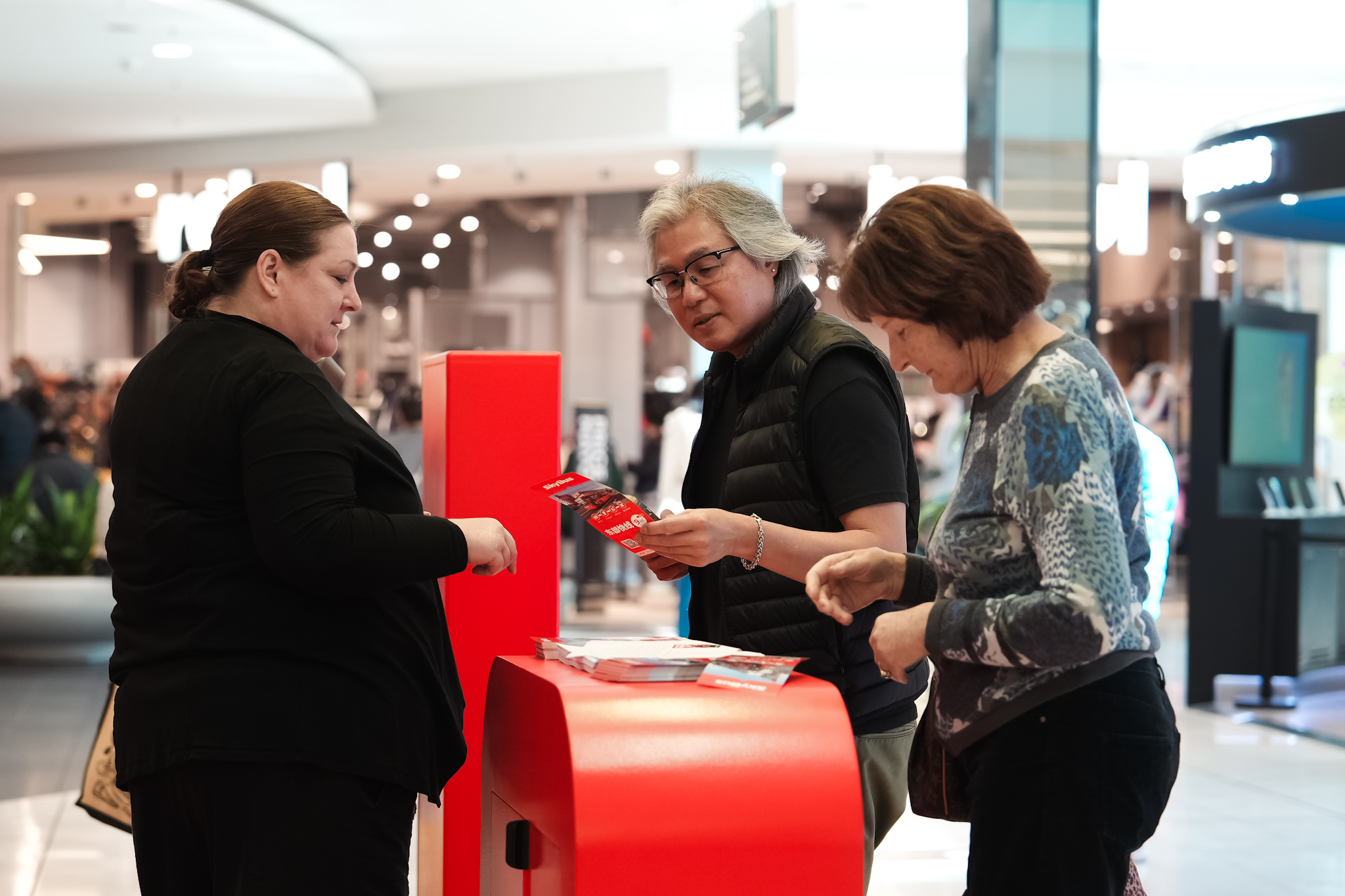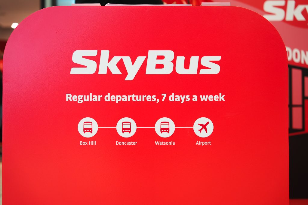 The SkyBus pop-up at Westfield Doncaster featured raised flooring with safety edging, a branded counter, a digital screen, and a deluxe wall with integrated content, all customised in SkyBus’s Pantone colours.