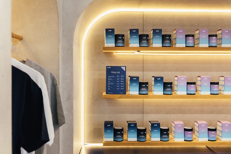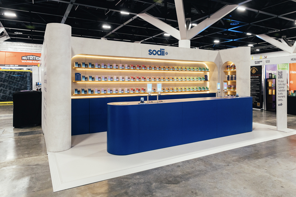 At the Aus Fitness Expo in Sydney, Sodii’s exhibition stand was designed as a standout trade show pop up that also served as a powerful brand activation. Clean concrete textures and a bold blue counter created a modern and premium look, while warm backlit shelving showcased Sodii’s full hydration range in a vibrant rainbow display.