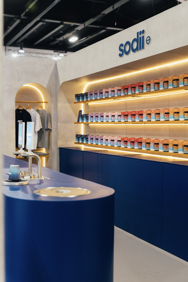 Sodii needed a premium exhibition stand that would stand out in a busy fitness expo and showcase their hydration brand effectively. The goal was to create a space that combined visual impact with interactive engagement, elevating the brand while encouraging visitor connection. Our design featured clean architectural finishes, a bold blue counter, and illuminated shelving that displayed the full product range in a vibrant rainbow.