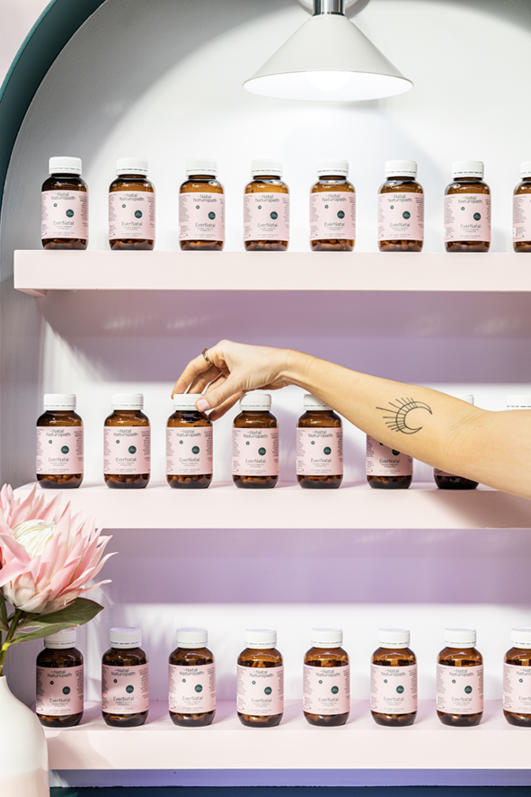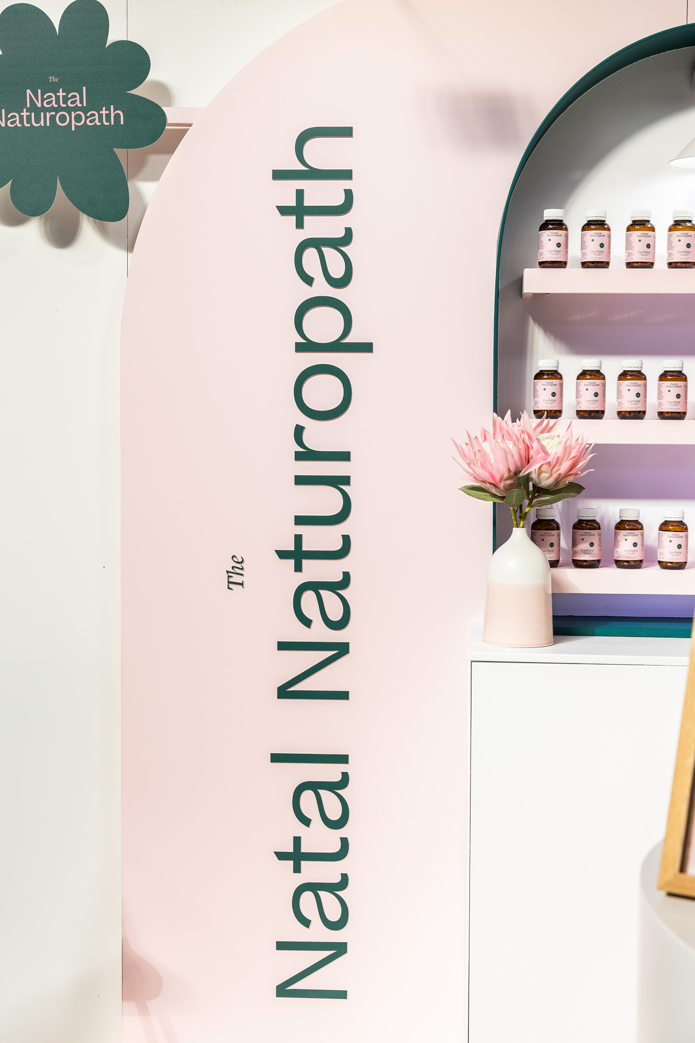 The Natal Naturopath had beautiful branding and icons, and our approach focused on highlighting these in a way that felt cohesive and impactful. We carefully integrated the branding across all key touchpoints, from custom decals and signage to subtle details on plinths and shelving, ensuring that every element reinforced the visual identity and made it instantly recognisable.