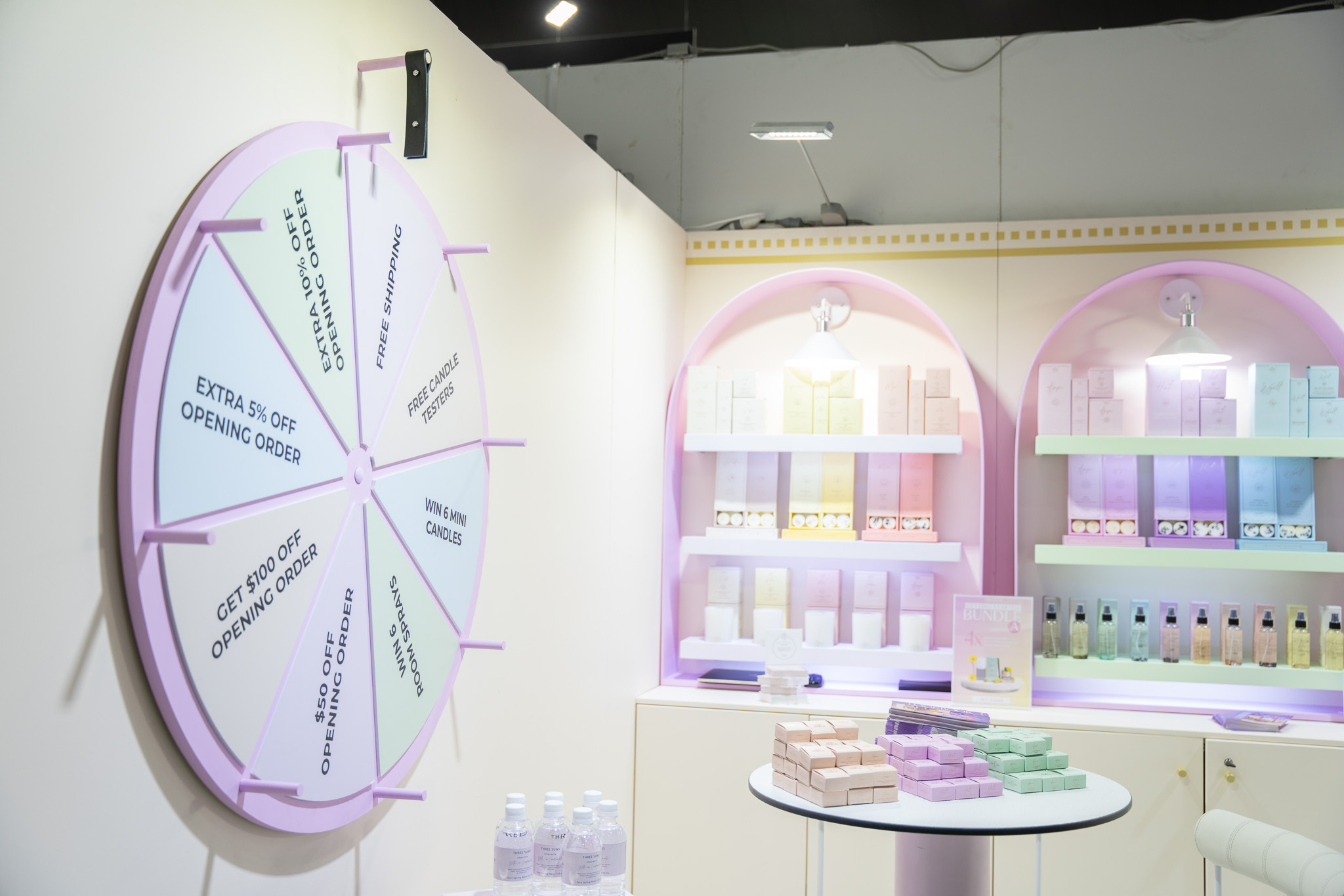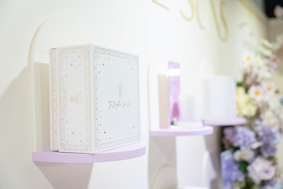 To bring the vision to life, we began with our Skins walls, which were custom coloured to match the exact Pantone shades of Three Suns, ensuring brand consistency and impact from the very first glance. From there, we introduced a playful spin wall to spark curiosity and engagement, while our signature arch walls were enhanced with sconce lighting to create warmth and highlight the products beautifully.