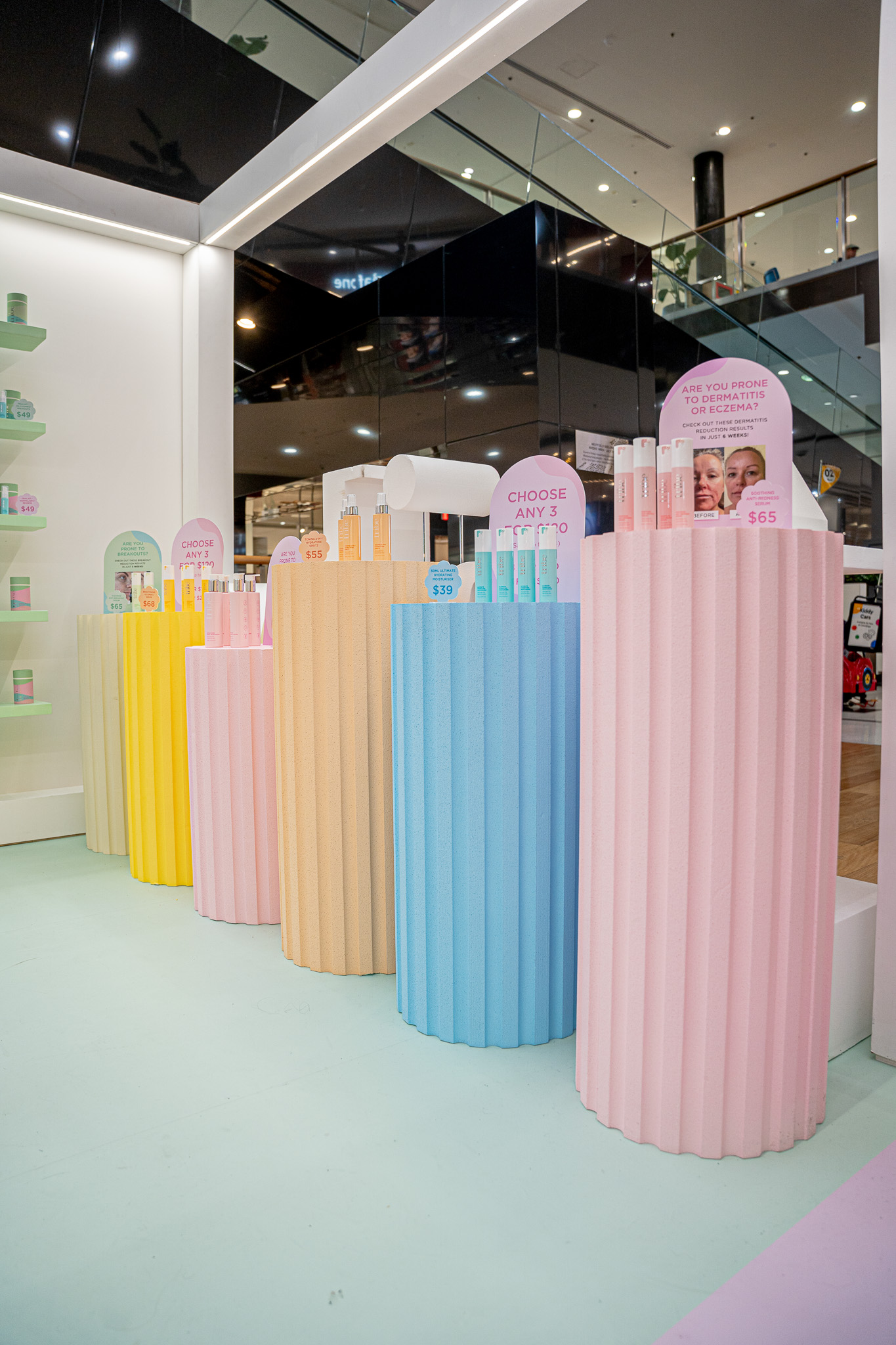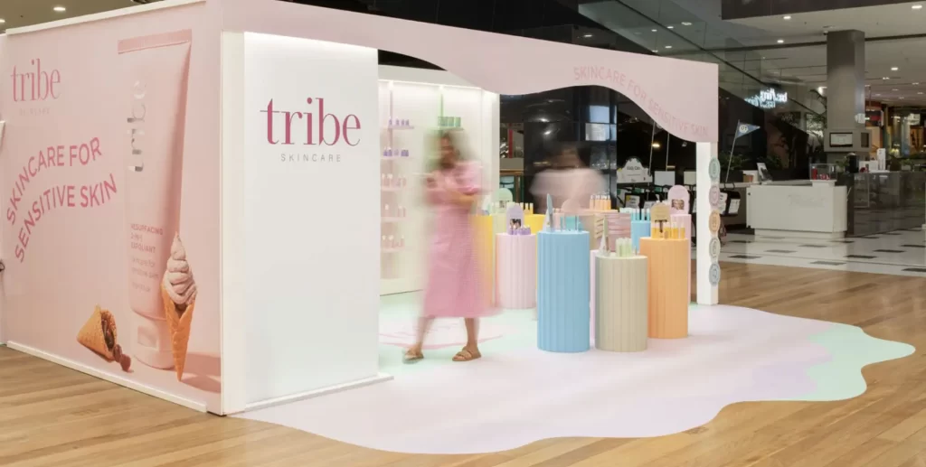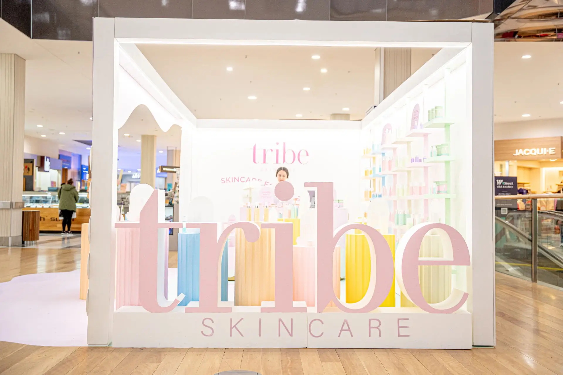 The goal was to create a pop-up at Westfield Geelong that captured the same energy and aesthetic as Tribe Skincare’s launch party while translating the brand’s playful, pastel identity into a tangible experience. They wanted a pastel paradise that highlighted their products through creative displays using different heights, making each item feel elevated and special. This retail activation would be the first time Tribe connected with customers face-to-face, providing an opportunity for engagement, discovery, and immersion in the brand world. Every detail needed to reflect the delicate, fun, and approachable nature of Tribe Skincare.