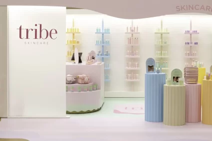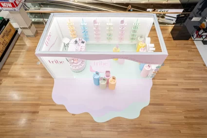 As Tribe Skincare’s first real live pop up, our thinking was focused on translating the brand from digital to physical in a way that truly resonated with visitors. We wanted the space to feel instantly recognisable, playful, and immersive, while also capturing the sense of a welcoming bricks and mortar store. The goal was to reflect Tribe’s pastel, fun, and approachable identity while creating an environment that encouraged customers to explore, touch, and interact with the products.